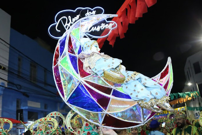 A peça, com predominância das cores azul e branco, traz consigo uma lua, representando as emoções, com um pierrô chorando e com um banjo na mão, em referência aos instrumentos de pau e corda – característicos dos blocos líricos. “Tem, também, na ponta um lampião, que era o que iluminava os trajetos dos blocos quando ainda não havia luz elétrica”, acrescenta Gustavo.